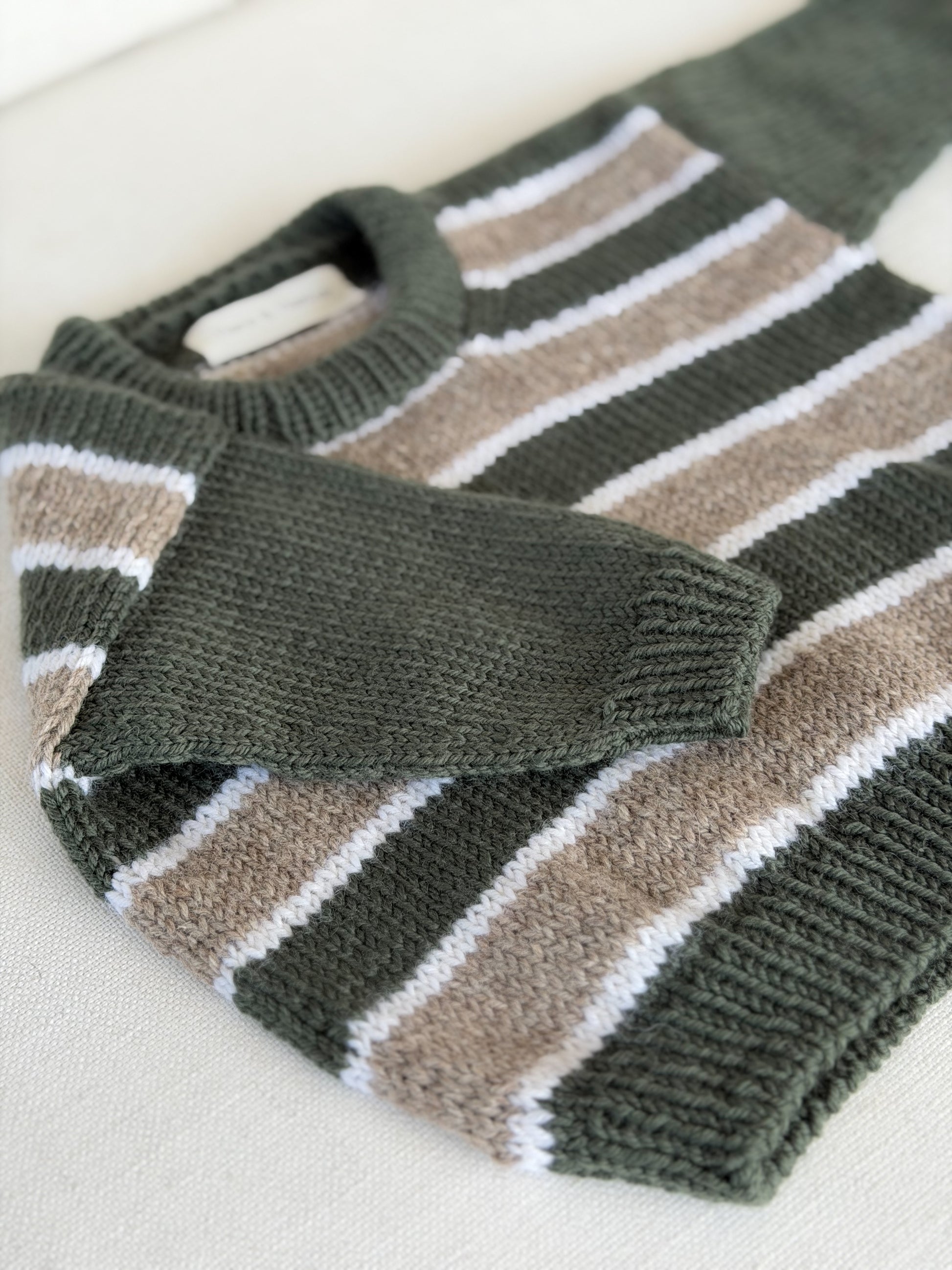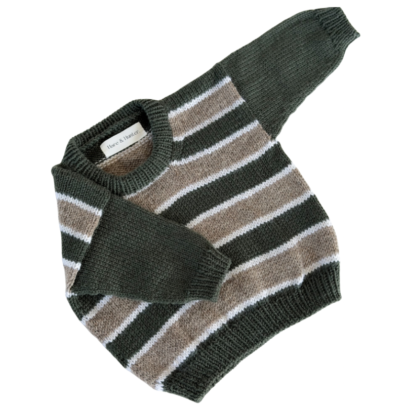 A timeless knit with a classic feel. Featuring earthy olive green, warm beige and soft white stripes through the body, paired with solid olive sleeves and ribbed trims, this beautifully crafted jumper is both practical and stylish. Designed for everyday wear, it’s cosy, breathable and perfect for layering through the cooler months.